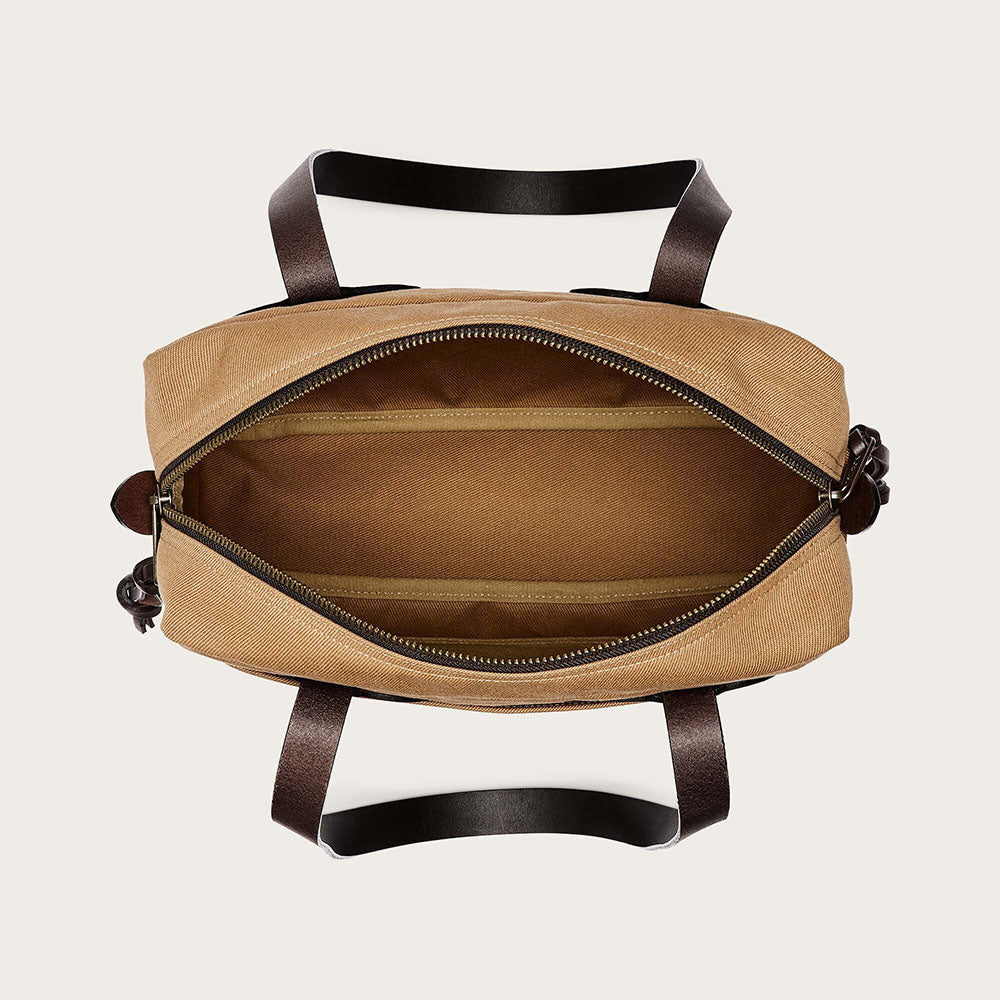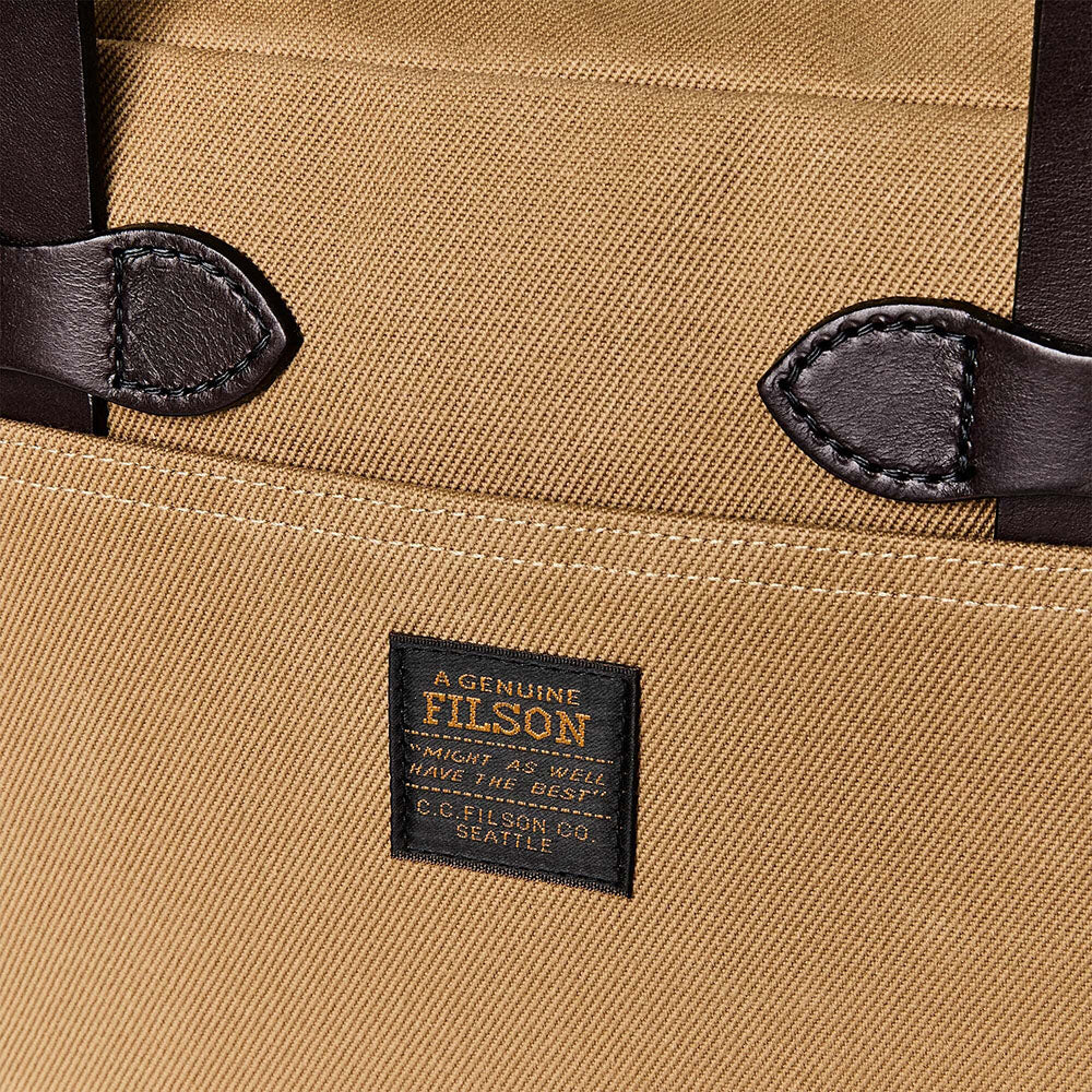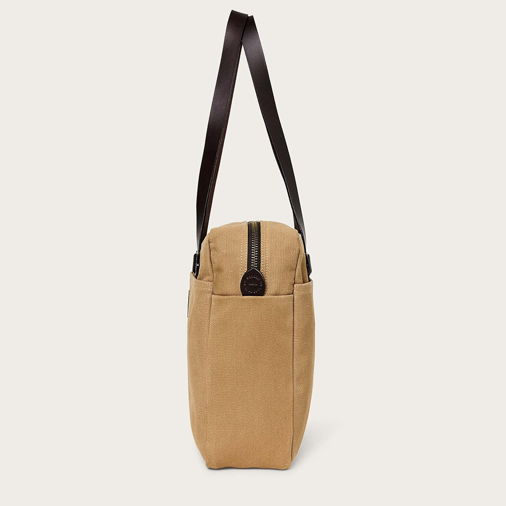 Le borse Filson Small Zipper Tote è una borsa versatile per l'uso quotidiano. I manici sono abbastanza lunghi per il trasporto a spalla e sono realizzati in Bridle Leather conciata al vegetale, abbastanza forte per l'uso equestre. Il comparto principale è protetto da una cerniera in ottone massiccio antiruggine con linguette in Bridle Leather per una facile apertura anche con i guanti. Il tessuto principale è il nostro iconico Rugged Twill della storica British Millerain in Inghilterra, leggermente cerato per la resistenza all'acqua.