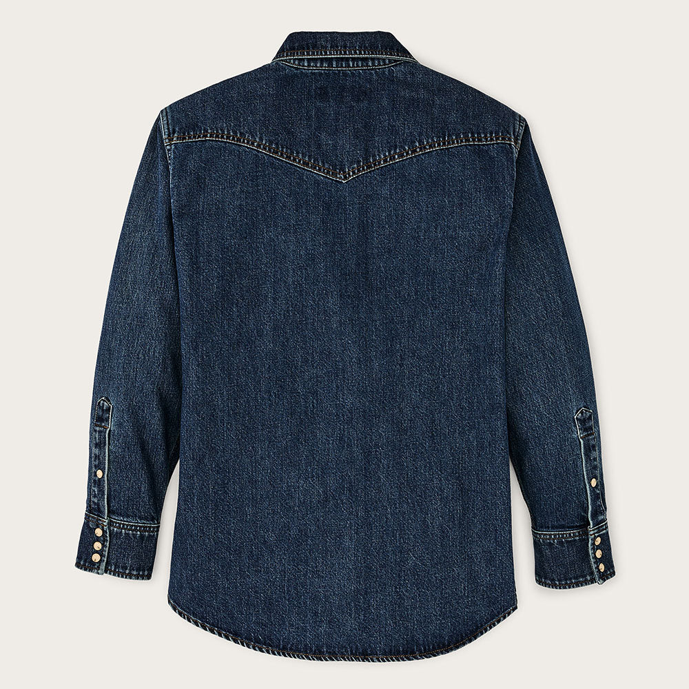 Filson Camicia Western da donna in denim realizzata al 100% in denim di cotone da 326 g, il classico tessuto da lavoro che ha raggiunto la notorietà nei ranch ed è ora diventato un must-have di tutti i giorni. Il twill con trama fitta a ordito offre decenni di resistenza e affidabilità. I carré a punta sul davanti e sul retro regalano un appeal inconfondibile, mentre il lato anteriore, le patte delle tasche e i polsini sono chiusi da bottoni a pressione, come da tradizione per le camicie western. La vestibilità è comoda e rilassata, con un orlo leggermente incurvato.